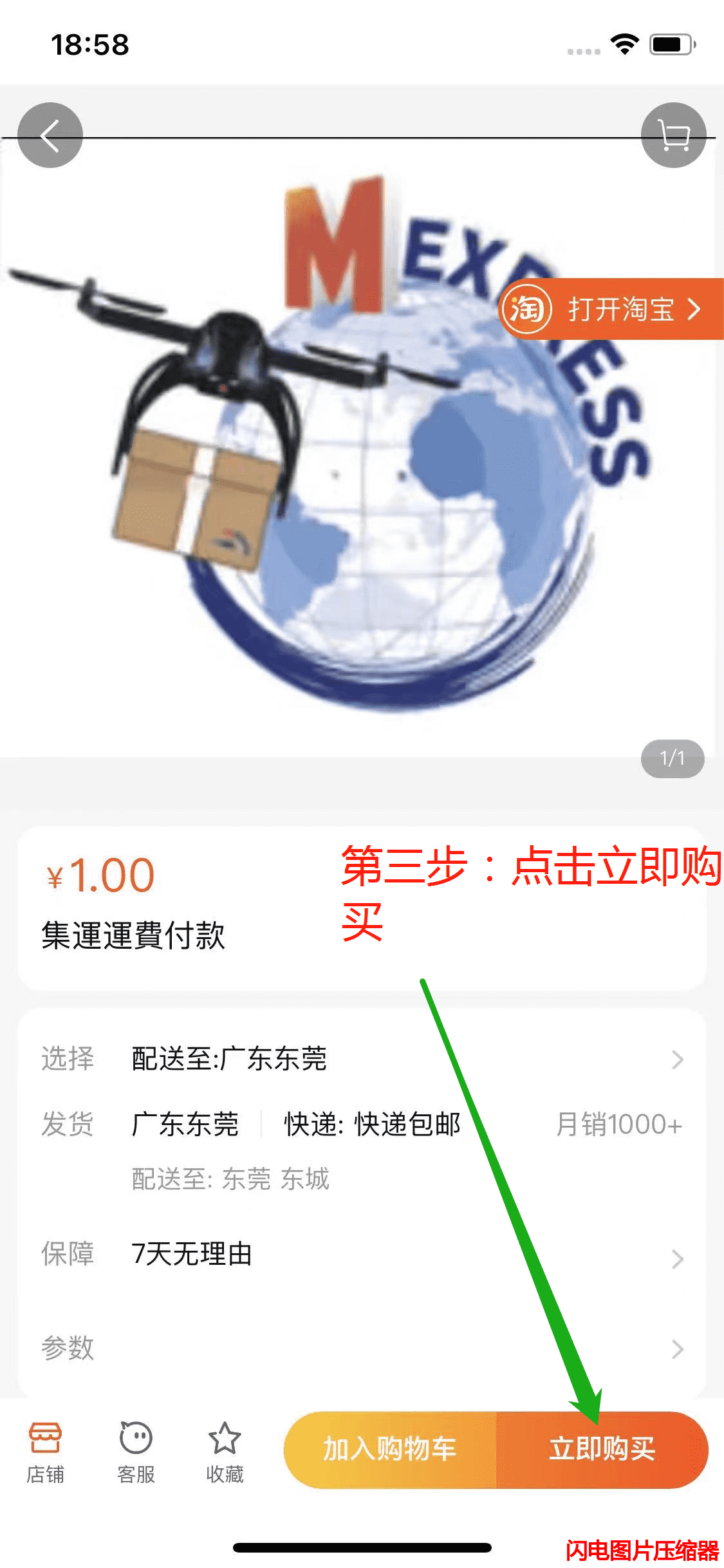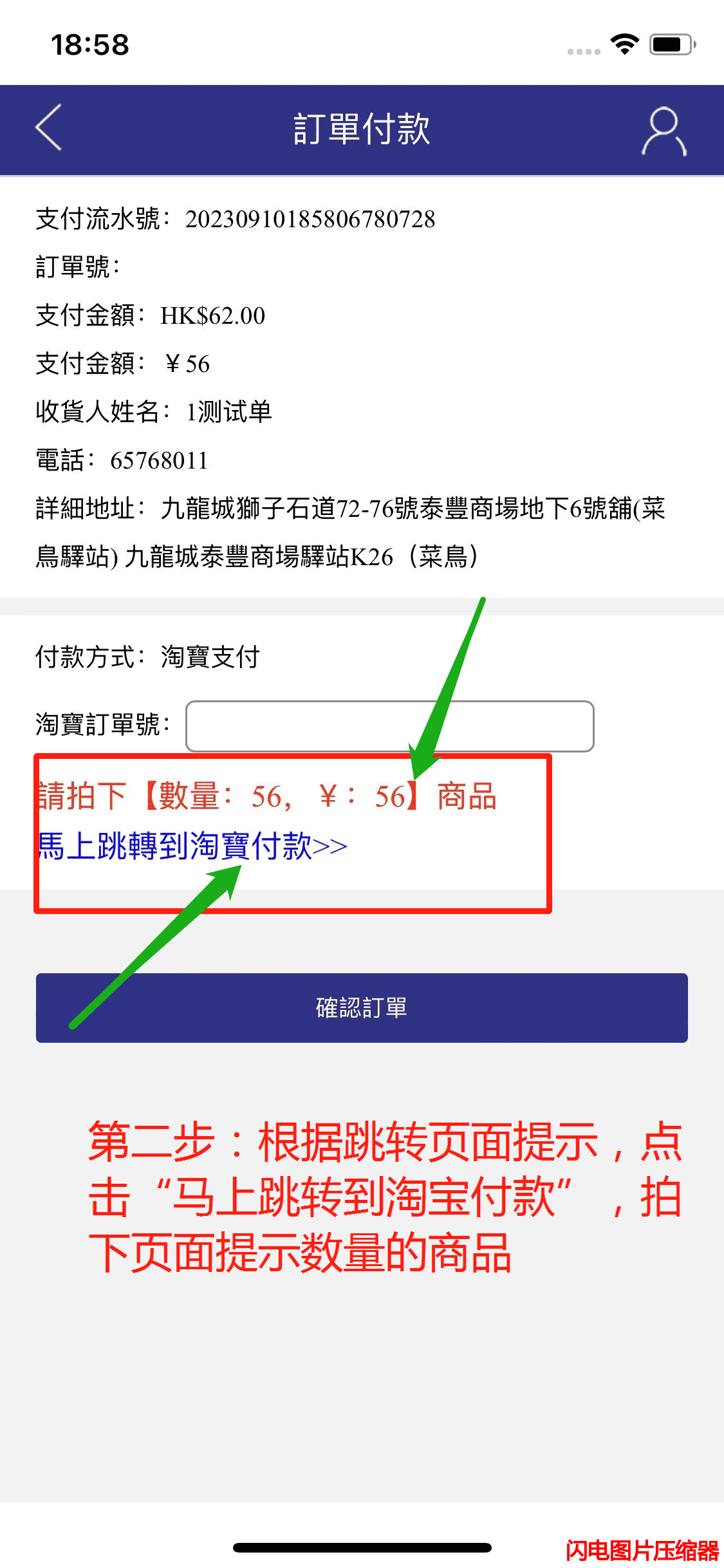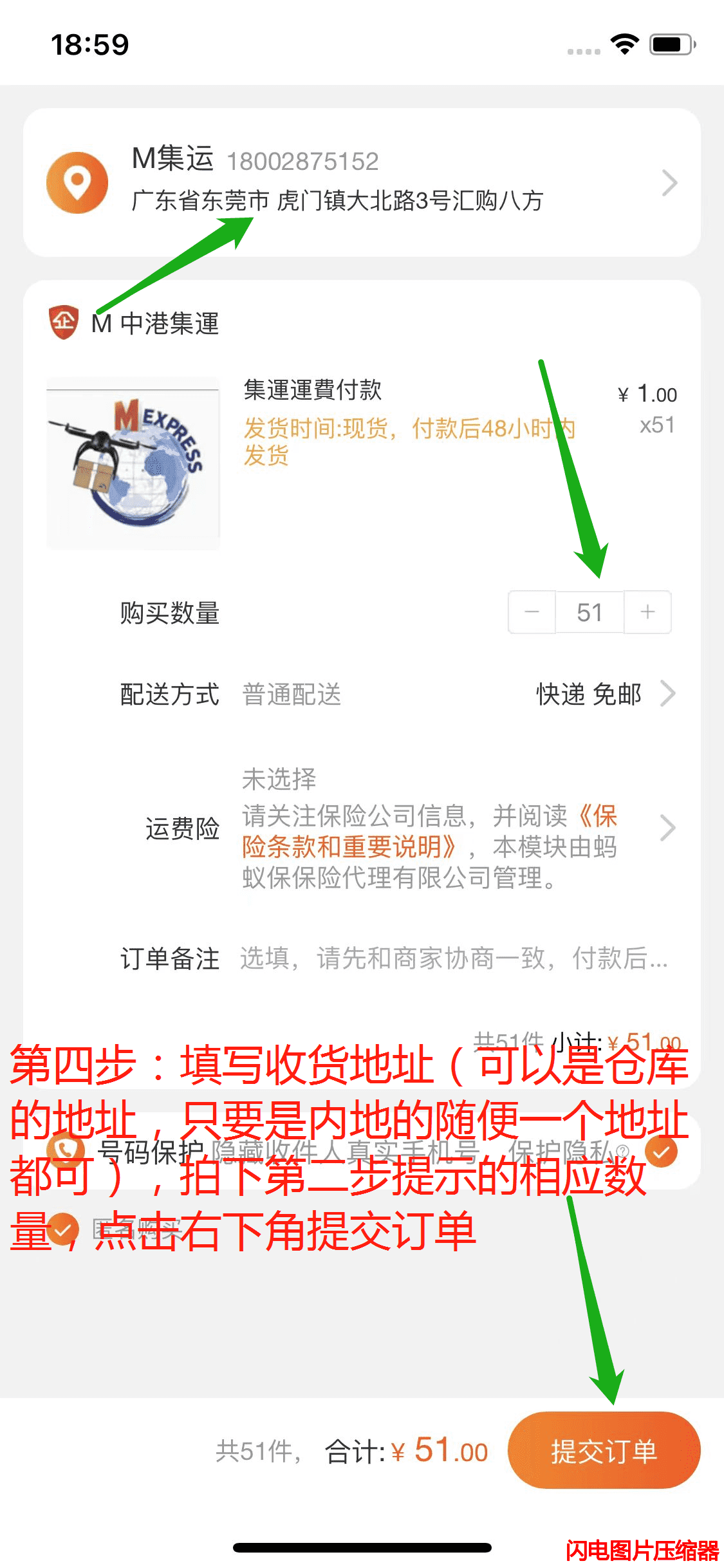 4、填写的收货地址(可以是仓库地址,只要是内地的随便一个地址都可以),拍下第二步提示的相应数量,点击右下角提交订单。