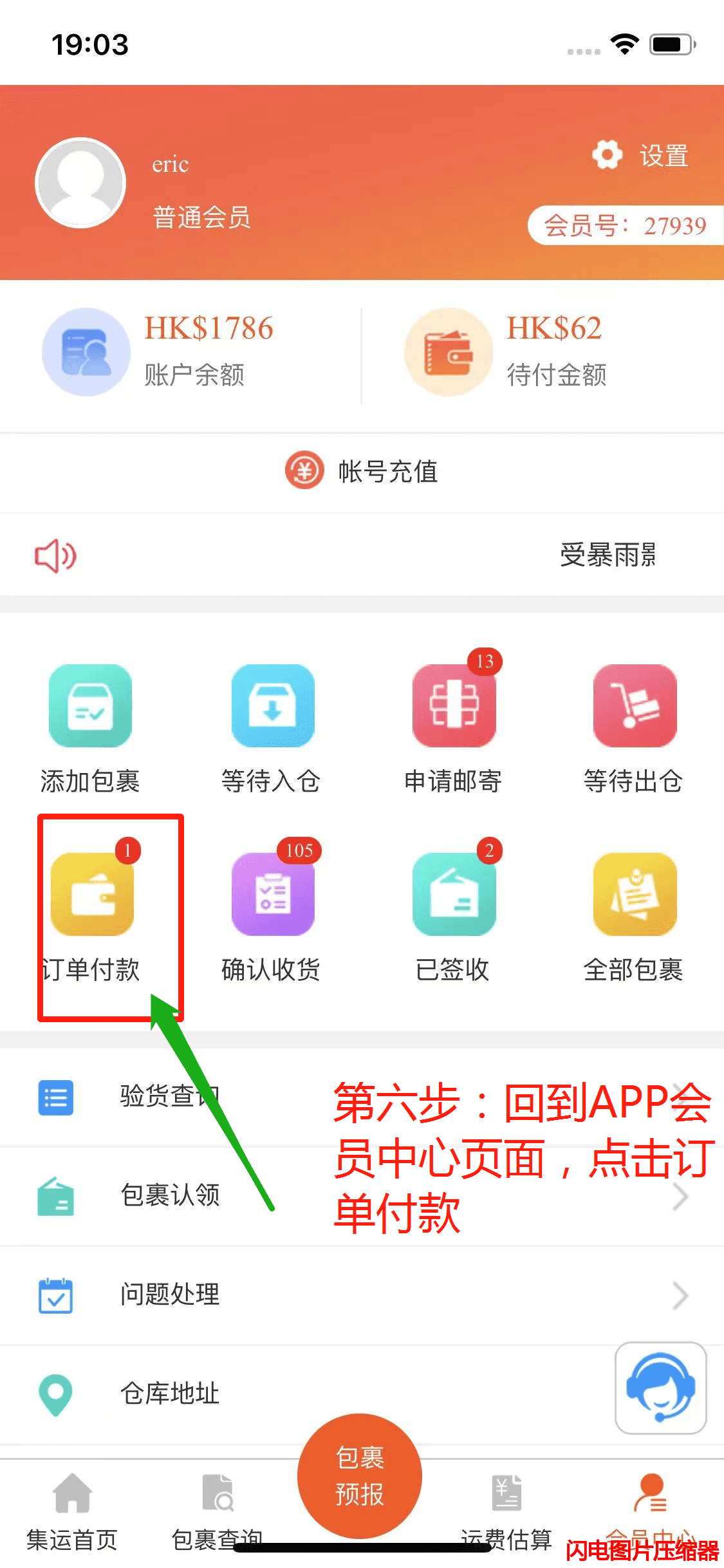 6、第六步: 回到APP会员中心页面,点击订单付款。